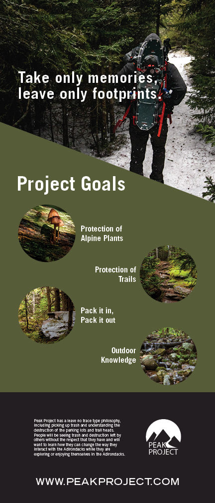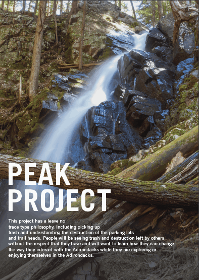 Peak Project was a non-profit I developed looking to conserve trails and wildlife of the Adirondack State Park. I presented this project as my senior project. The project had different types of informative products that ranged from logo design, posters, a patch set, business cards, stickers, and a website developed fully with HTML, CSS, and JavaScript.