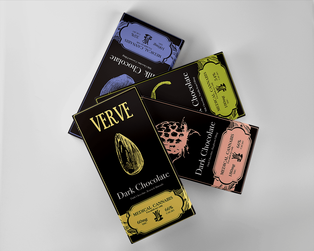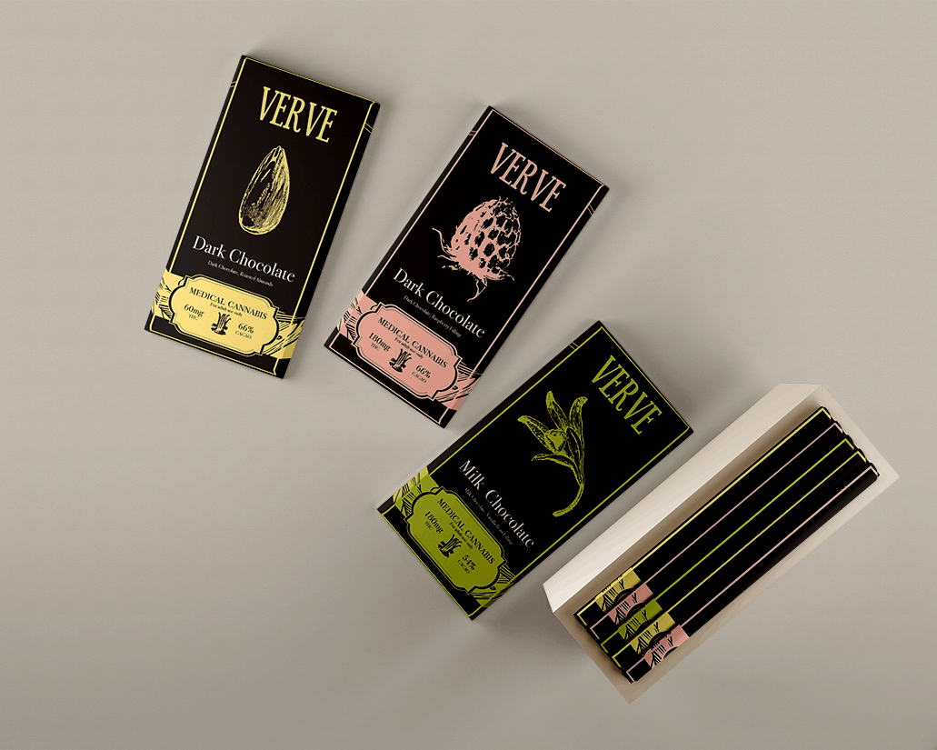 Verve is a brand of medical cannabis chocolate bars. I created this brand of high-class medical cannabis chocolate bars. The owner wanted this brand to be unique and created something that had some style. The customers for this brand would be wealthy people combining high-grade cannabis with world-class chocolate. There are four flavors. Each chocolate bar has a different color representation and different sketches on the front for the various flavors you can purchase. The different colors and illustrations represent the inside ingredients of each bar.